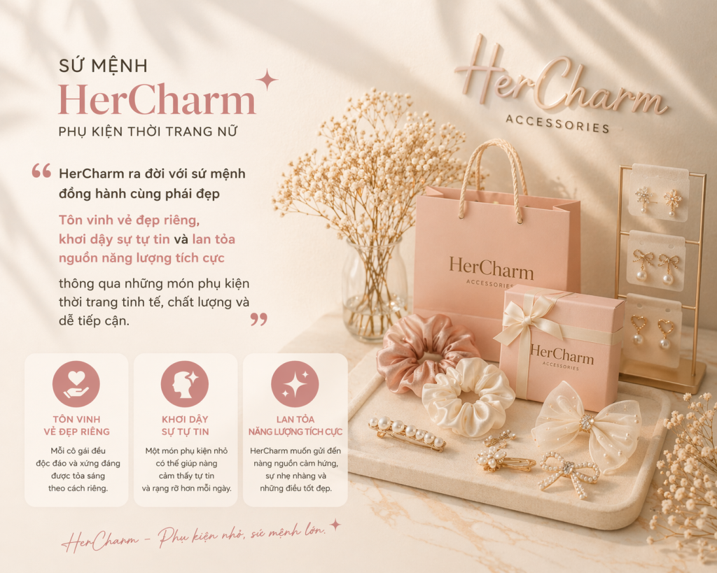 HerCharm – Đánh thức vẻ đẹp tiềm ẩn qua từng chi tiết. Tại HerCharm, chúng tôi tin rằng phụ nữ không cần phải chạy theo những tiêu chuẩn xa xôi để trở nên lôi cuốn. Đôi khi, sự quyến rũ (Charm) nằm ngay trong cách bạn chọn một đôi khuyên tai lấp lánh, một chiếc kẹp tóc tinh tế hay một sợi dây chuyền thanh mảnh để tự tin là chính mình. Ra đời với niềm đam mê bất tận dành cho cái đẹp, HerCharm là “trạm dừng chân” lý tưởng cho những cô nàng hiện đại đang tìm kiếm những món phụ kiện thời trang tinh tế, dẫn đầu xu hướng và mang đậm dấu ấn cá nhân.