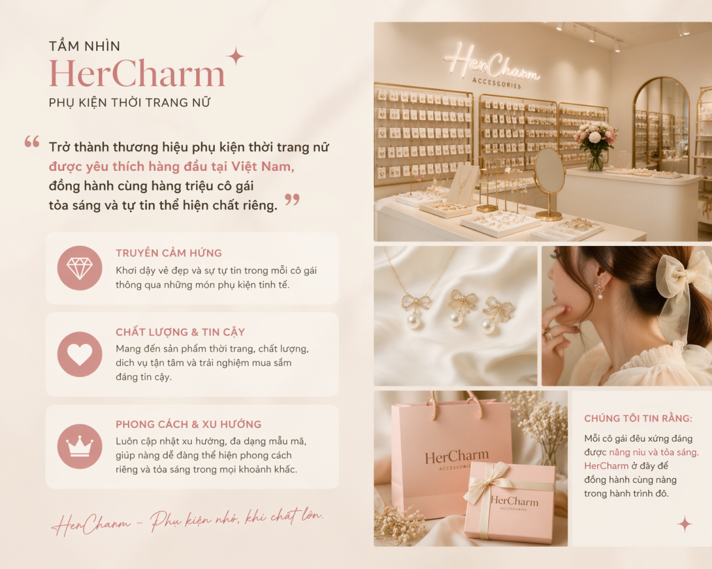 Trở thành thương hiệu phụ kiện thời trang nữ hàng đầu, là lựa chọn ưu tiên của phái đẹp khi muốn hoàn thiện phong cách cá nhân. HerCharm hướng tới việc xây dựng một cộng đồng phụ nữ tự tin, biết yêu bản thân và luôn tỏa sáng theo cách riêng của mình.